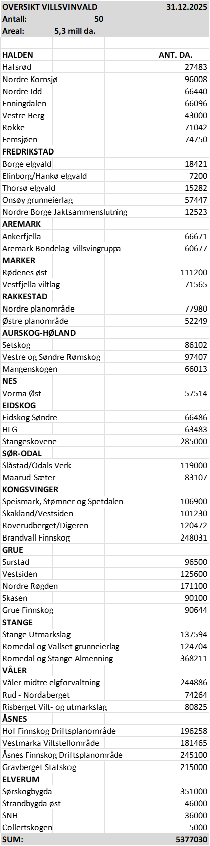 Pr. 31.12.2025 har vi fått 50 villsvinvald fordelt på 5,3 mill. da. Dette arealet innbefatter ca. 6500 grunneiere.