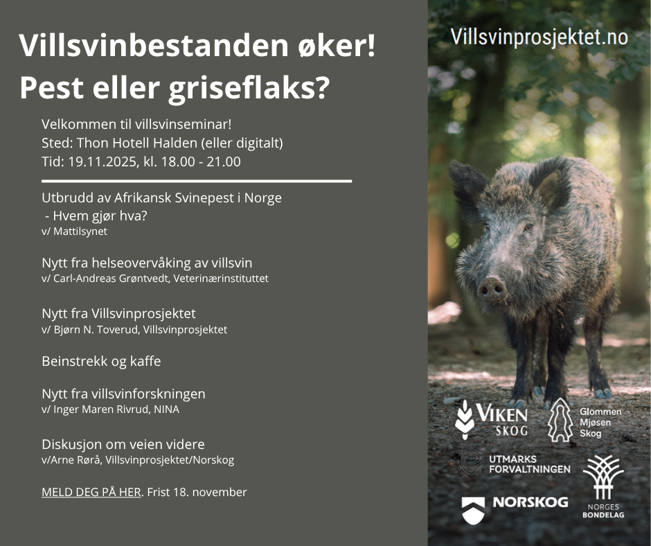 Villsvinprosjektet arrangerer villsvinseminaret "Pest eller griseflaks?" i Halden 19. november 2025.