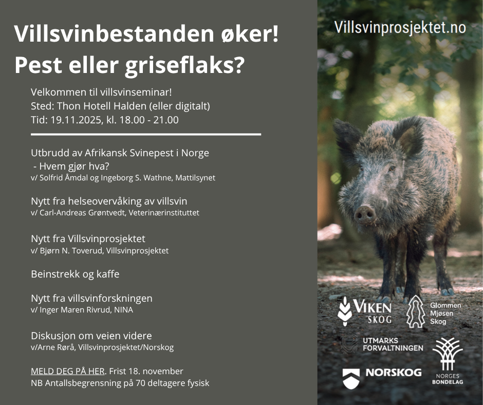 Villsvinprosjektet arrangerte villsvinseminar i Halden 19. november, med foredrag fra Mattilsynet, Veterinærinstituttet, Villsvinprosjektet og NINA. Se presentasjoner, pressemelding og opptak fra seminaret under.